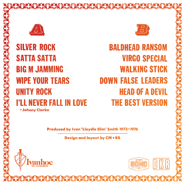 DKR SAYS: Another excellent find here, an unreleased dub/instrumental album compiled by Lloydie Slim at the end of the 70s, featuring exclusive dubwise & instrumental cuts to many of his rhythms from earlier in the decade. As a bonus we've added 2 more tracks to the original 10 track album tape - the vocal & dub cuts to Johnny Clarke's "I'll Never Fall in Love Again", one of Slim's personal favorites of his productions. This single was originally released in 1975 in JA on his Don One label, and again in New York a few years later on his namesake Ivanhoe the Conqueror label. This album is a great listen which reminds us of the classic Channel 1 Revolutionaries instrumentals of the mid/late 70s.